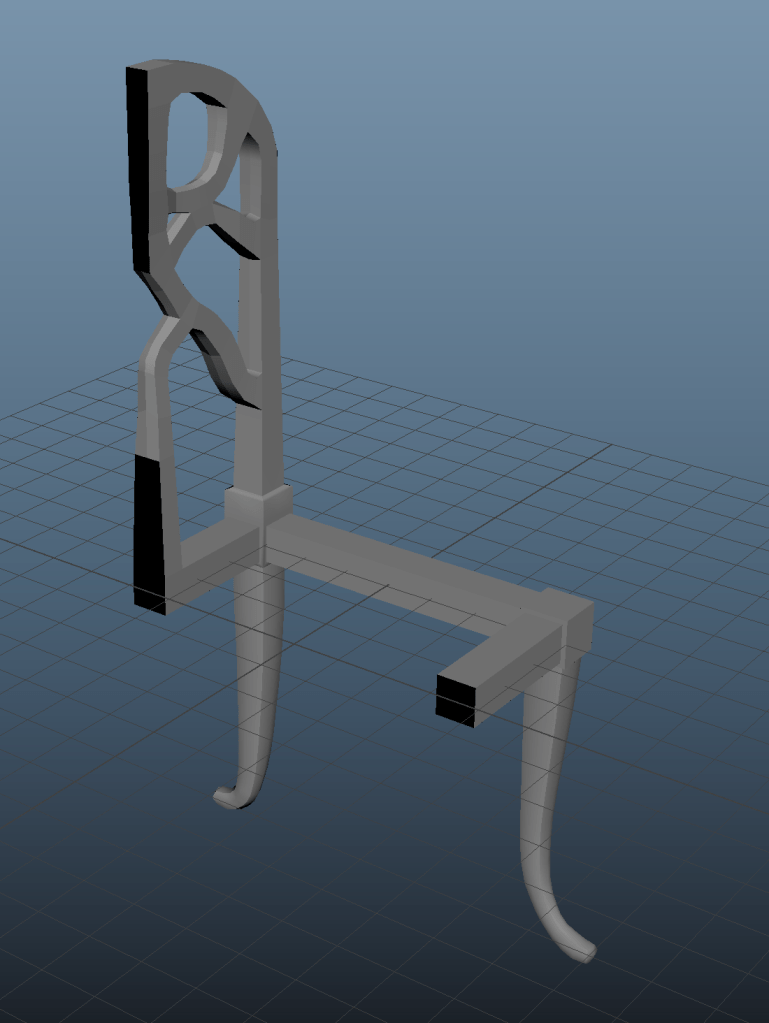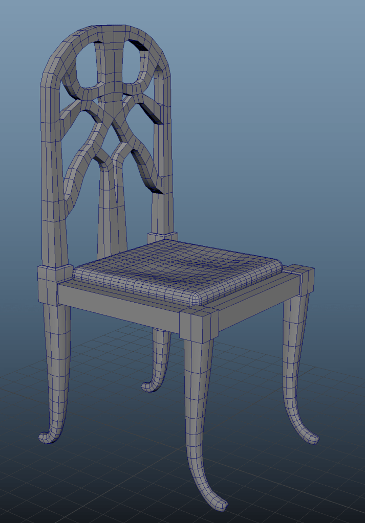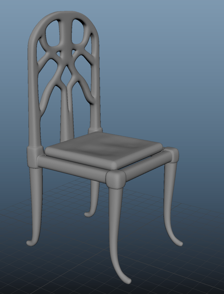 For the chair’s back I chose the more complicated reference to put myself to test. I modelled half the chair and then mirrored the other half.