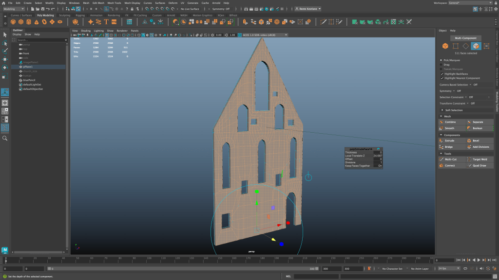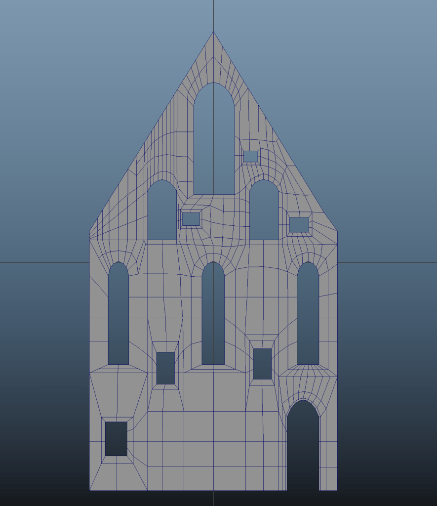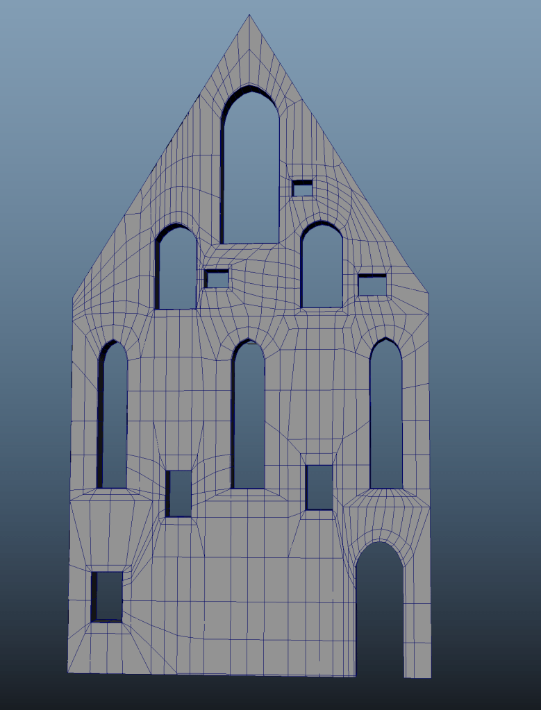 With the front wall I ran into some topology issues because I think I forgot to extrude some of the windows initially. Not completely sure, but when I started the side wall, I think I understood how I could have done the front wall better and easier. This is a note for myself for next time!