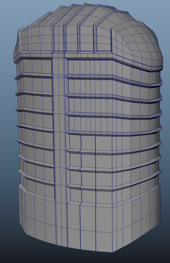 The building is created in two parts – Front wall and side walls. Both of them started as planes. I created a plane mesh, then using edge loops marked the windows and the door, extruded the planar faces to create the windows and then deleted the faces the make holes. Adding edge loops I gave the windows their shape. After the planar model was ready, I extruded it to give it 3D dimensions. Then, I added the edge loops to the corners to retain the shape when smoothing. I Used the edge slide feature I adjusted the loops to make a cleaner topology and avoid potential shading issues. Some edge loops were possible to be merged together to reduce polycount.