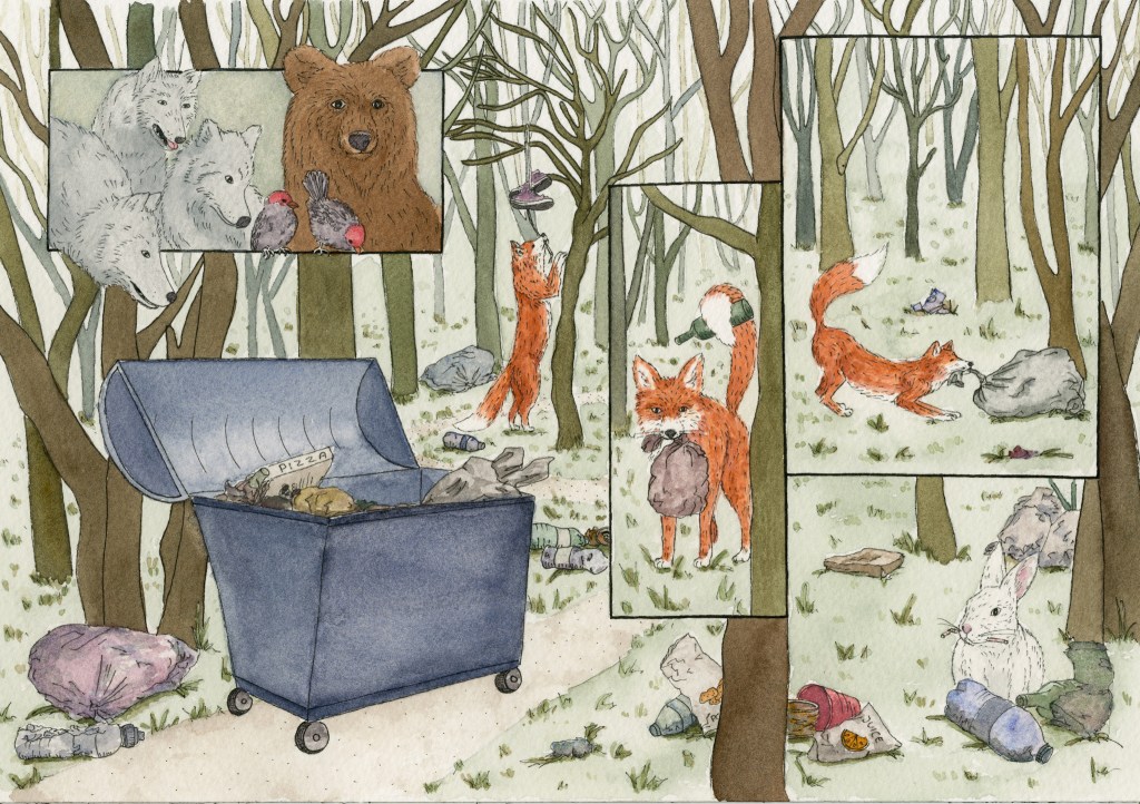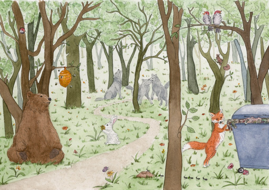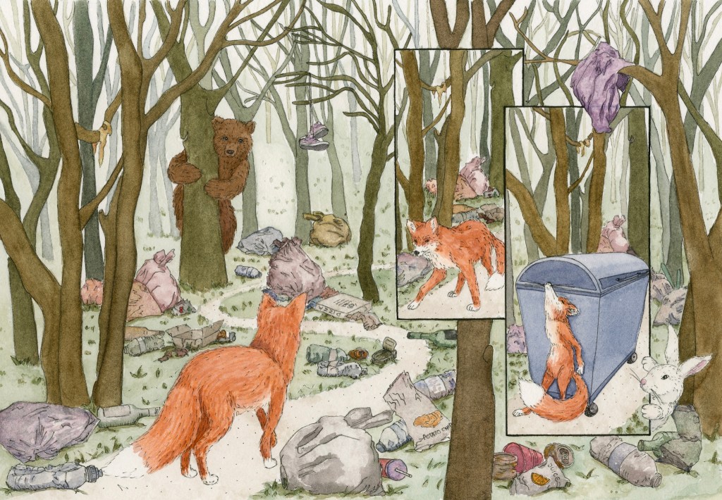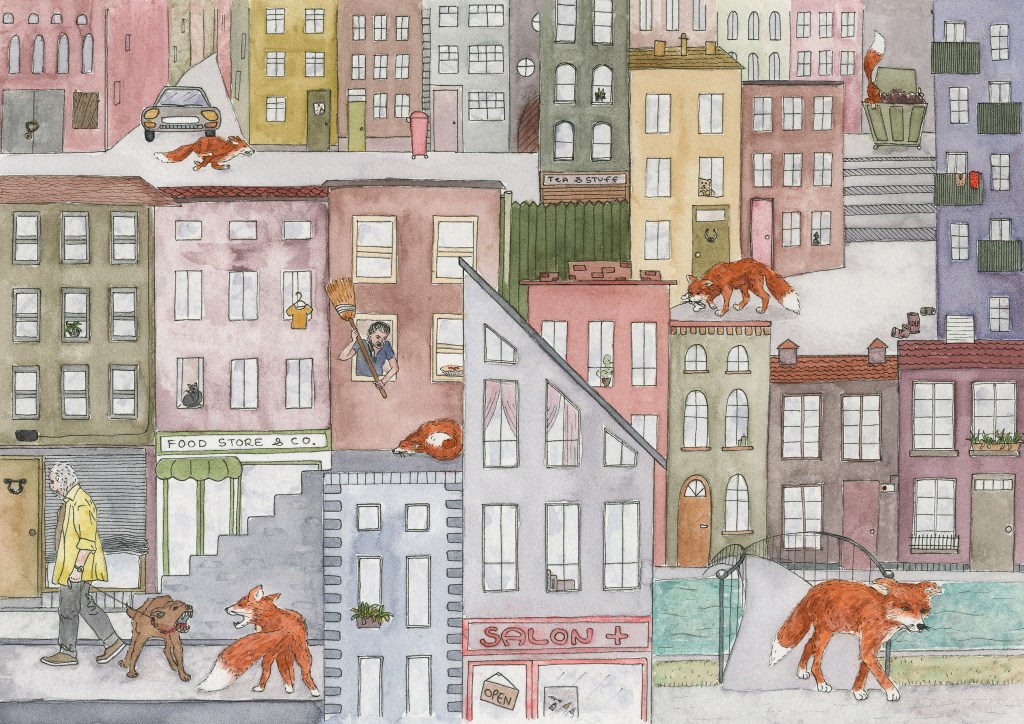 A short illustrated book telling a story of a fox moving out of the city only to find the forest in turmoil. Story and illustration by me.